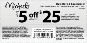 Michael’s is ready for your summer project! Here is a coupon to get $5 off every $25 you spend, so stock up on supplies for home, for birthday parties, summer camp, anything you can think of! And save, save, save!